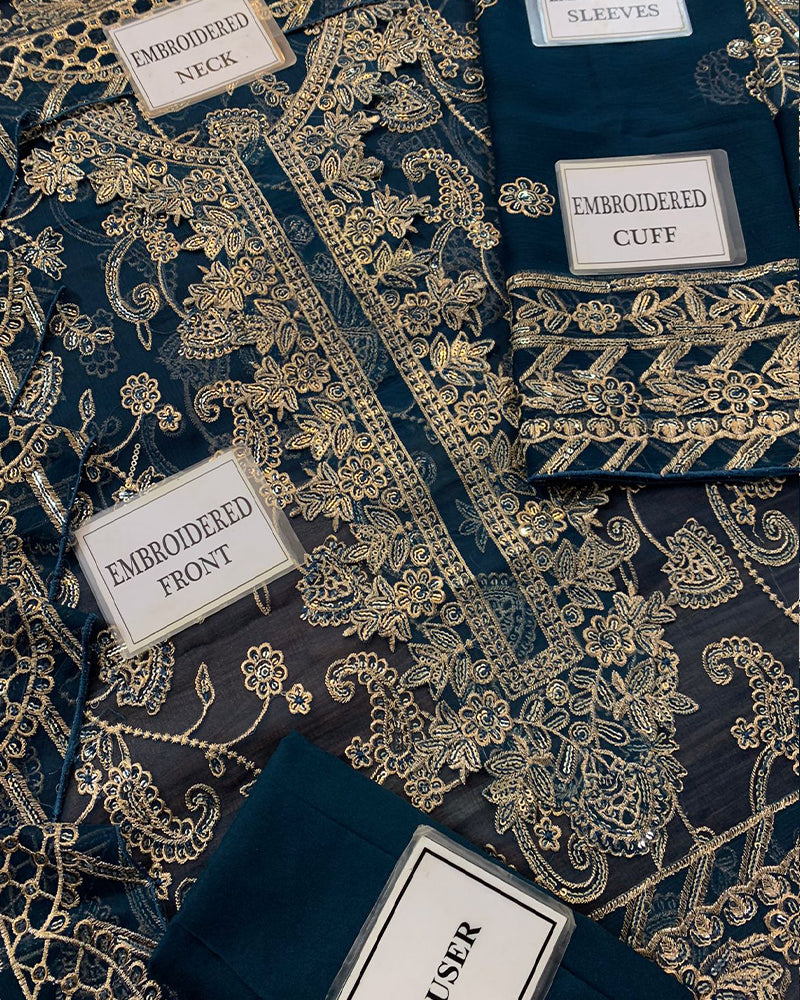Front (Cationic Chiffon): Heavy embroidered with detailed neck, chowk, and daman patches