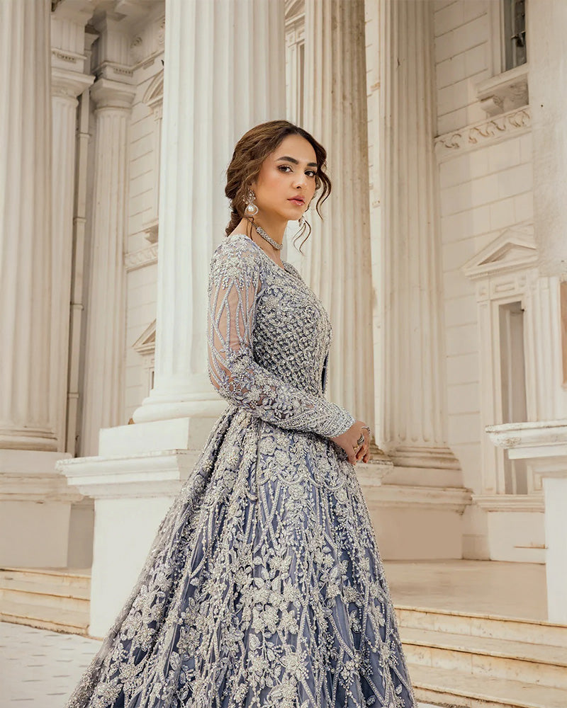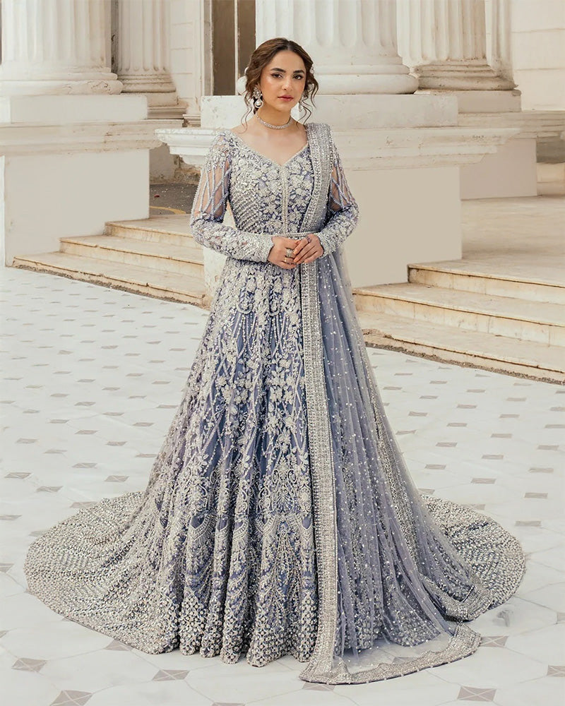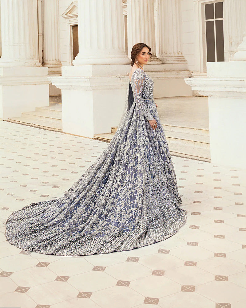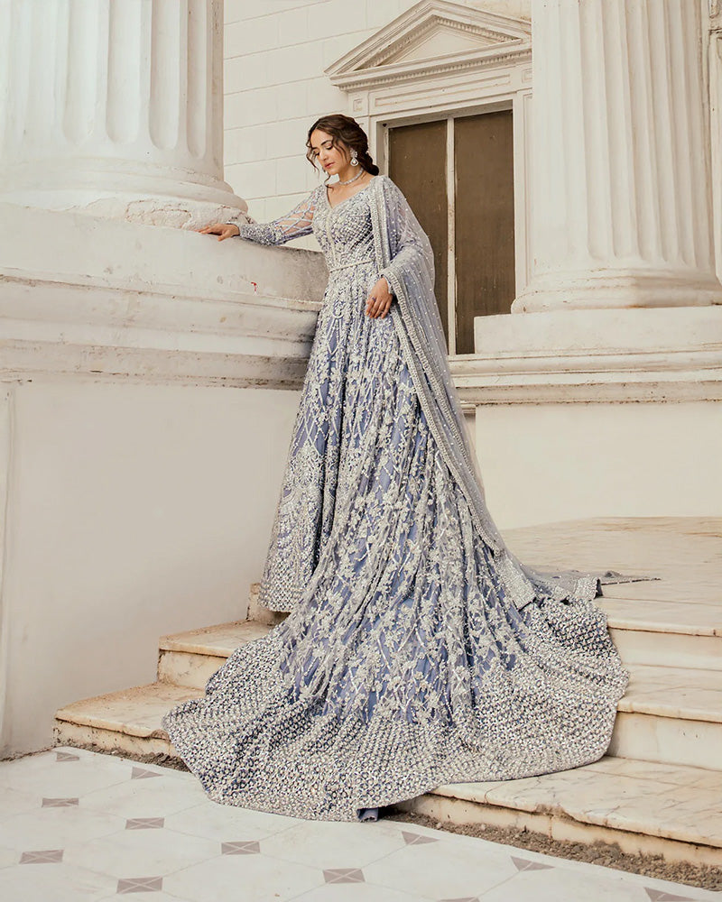 Step into the spotlight with this ethereal silver-blue organza ensemble, exquisitely embroidered and embellished to perfection. Designed with intricate kali panels, embellished sleeves, and a richly crafted dupatta, this luxurious attire embodies bridal grandeur and timeless sophistication—perfect for weddings and formal soirées.