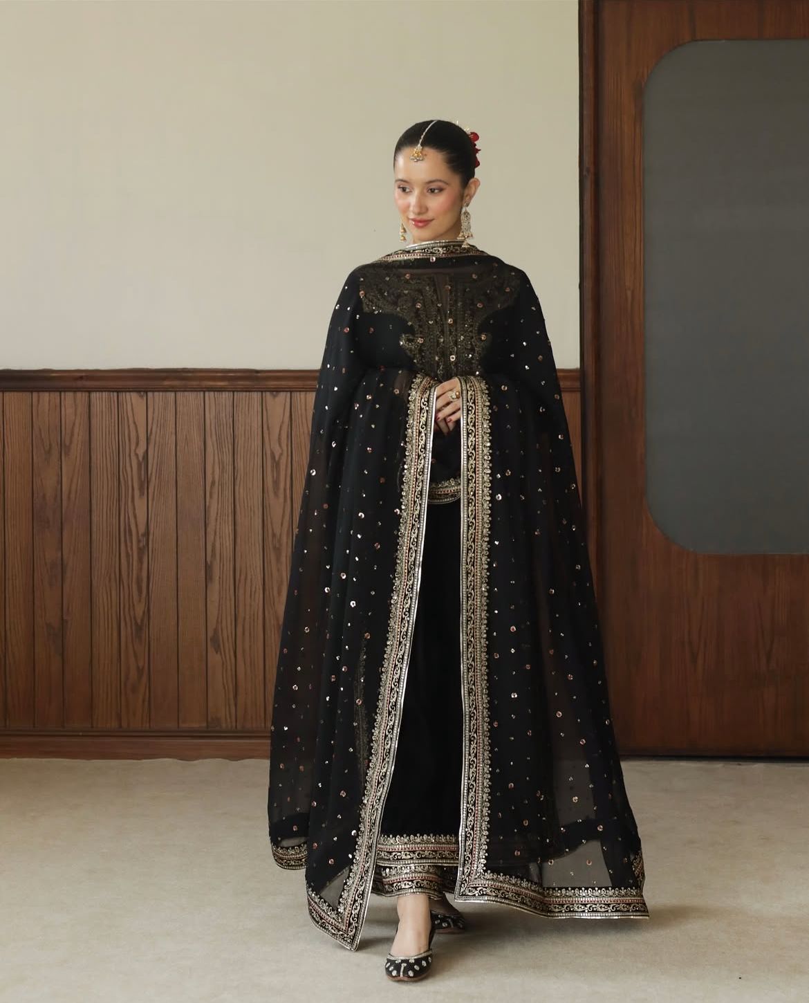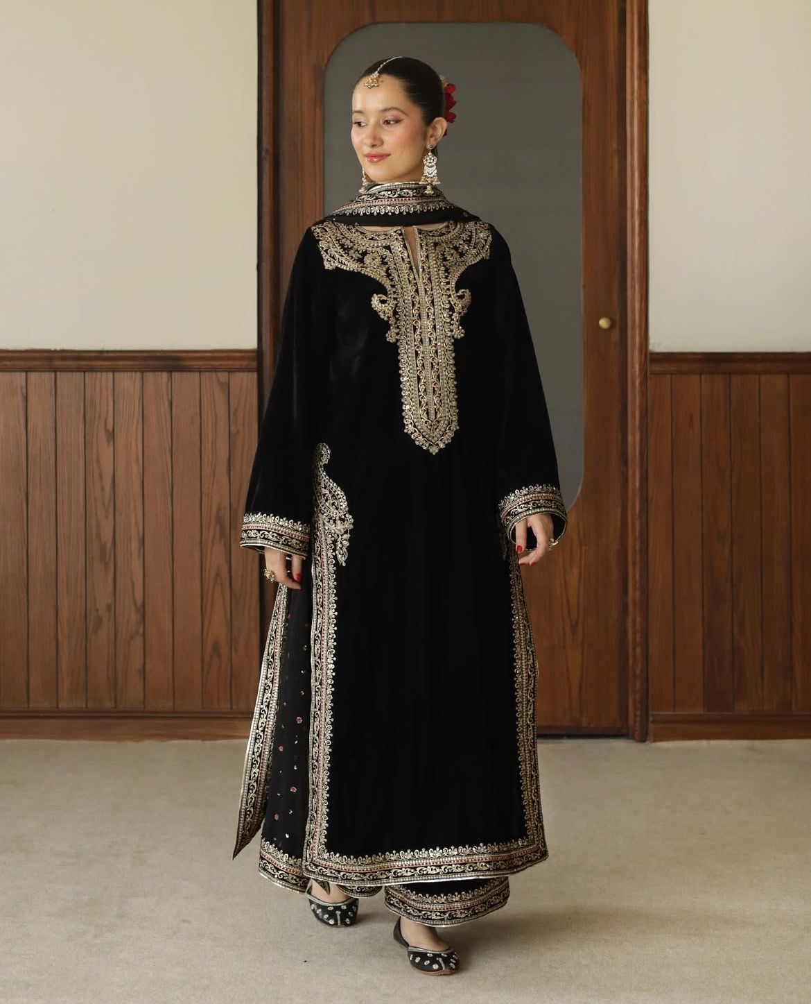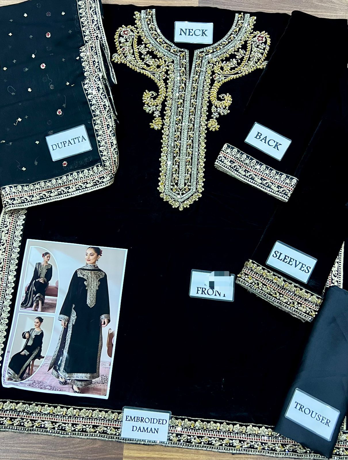 Front: Velvet fully heavy alternate embroidered spengle work with full adda, cutdana & crystal hand embellishment and embroidered spengle daman lace with chak lace detailing