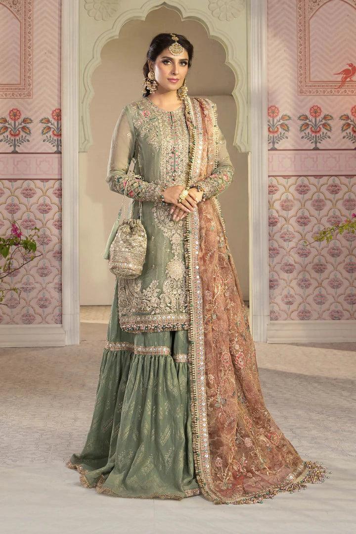 A stunning festive ensemble crafted with elegance — featuring rich net fabric, handcrafted details, heavy embroidery, kiran lace finishing, and a classic jamawar trouser. This article reflects true Maria B luxury with beautifully curated embellishments, tassels, and premium borders.