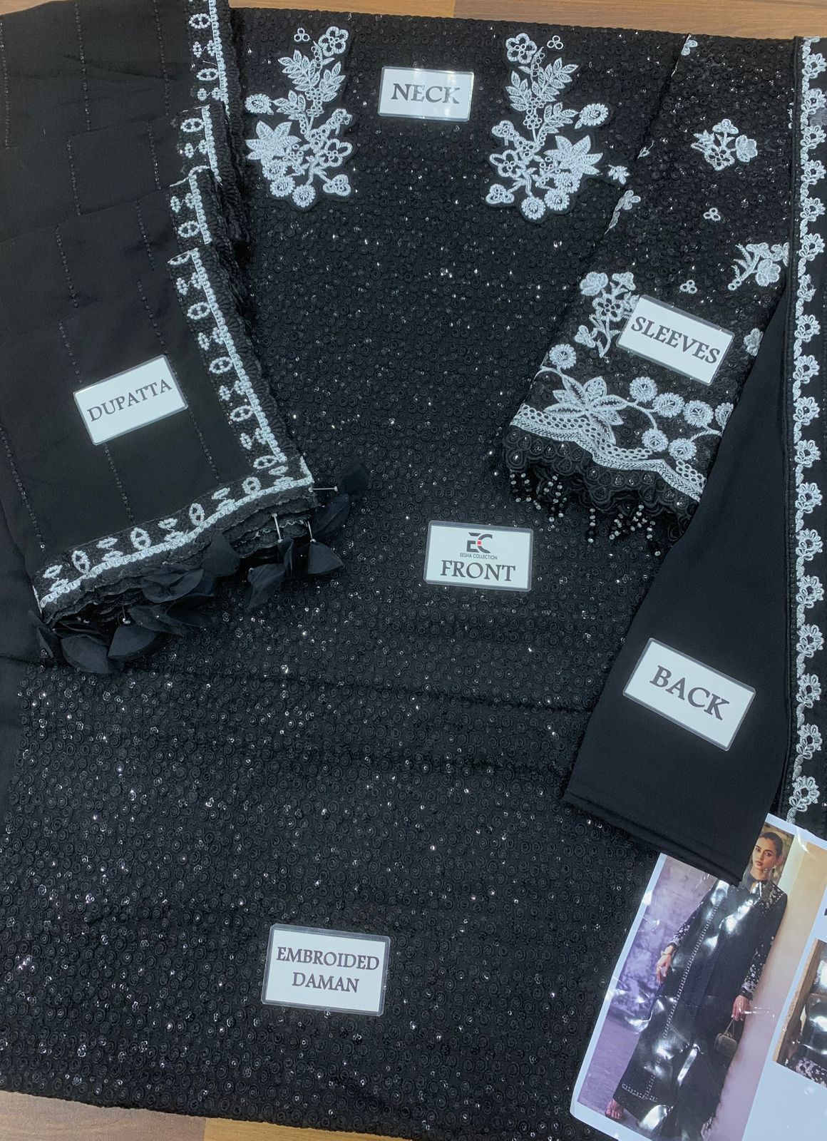 Fully heavy embroidered chiffon front, lavishly decorated with spengle and sequence work, and a heavy embroidered neckline finished with a detailed chawk lace border.