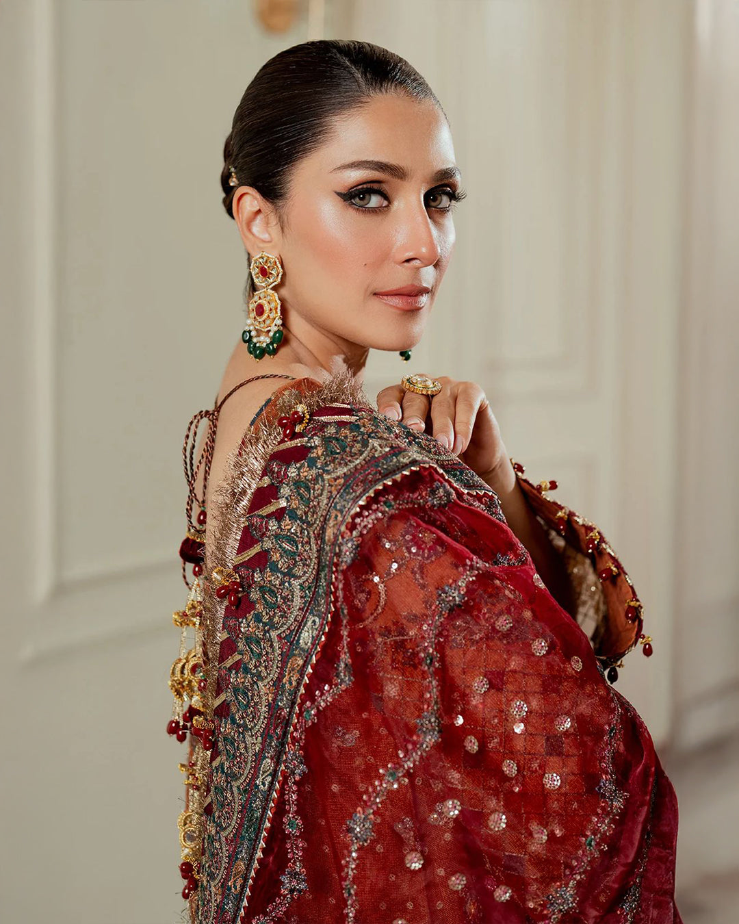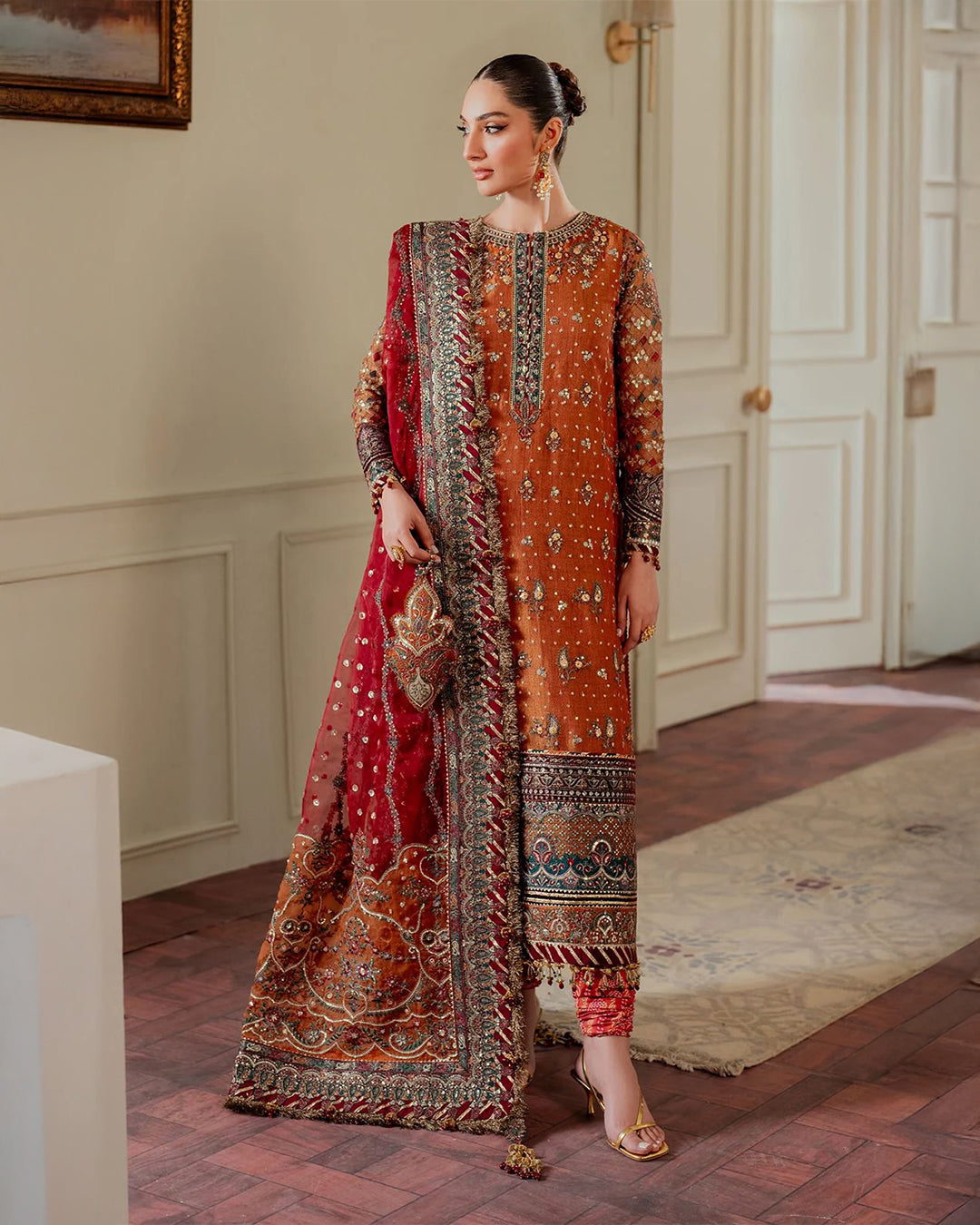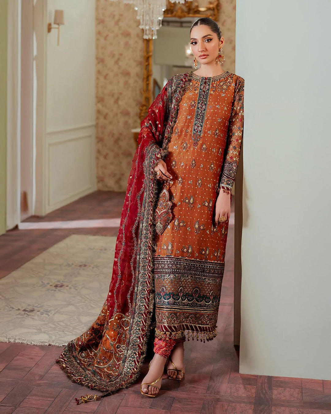 Dupatta (Net): Fully heavy embroidered with 4-side cut border applique, hanging tussles & ready-to-wear finish