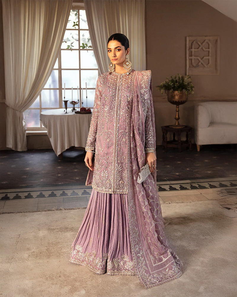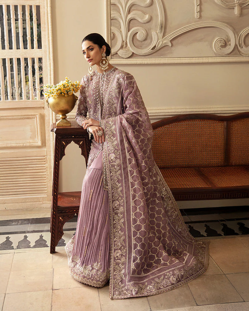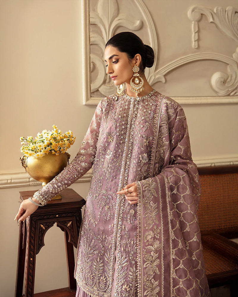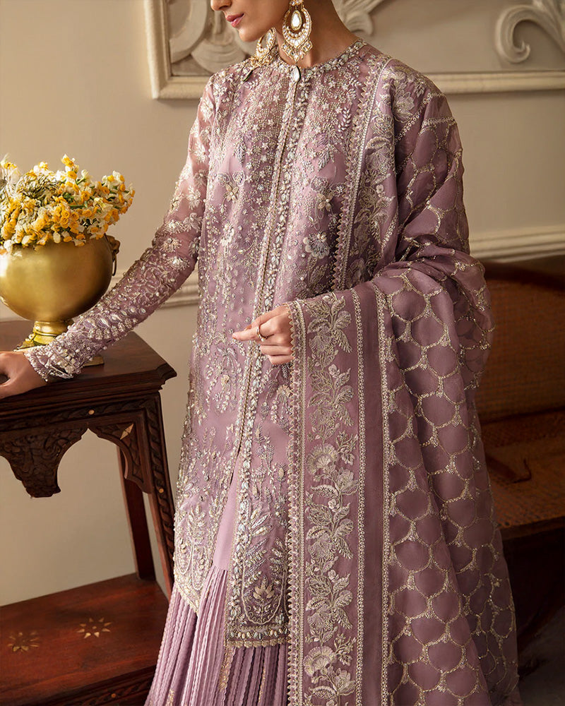 Elevate your festive and wedding wardrobe with this enchanting lilac ensemble, crafted with exquisite embroidery and hand embellishments. Featuring a regal long shirt, paired with a beautifully embroidered organza dupatta and a flowy sharara, this outfit embodies elegance, luxury, and timeless tradition.