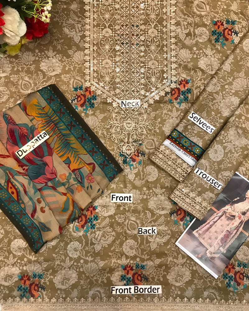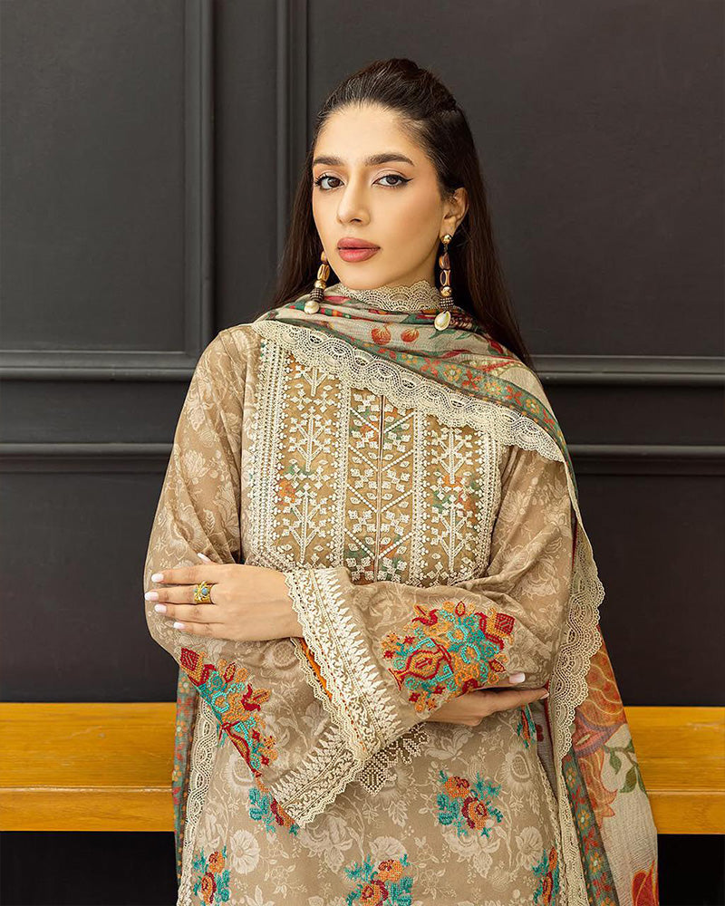 Front (Printed Lawn): Digitally printed premium lawn fabric with heavy embroidered neck and front border