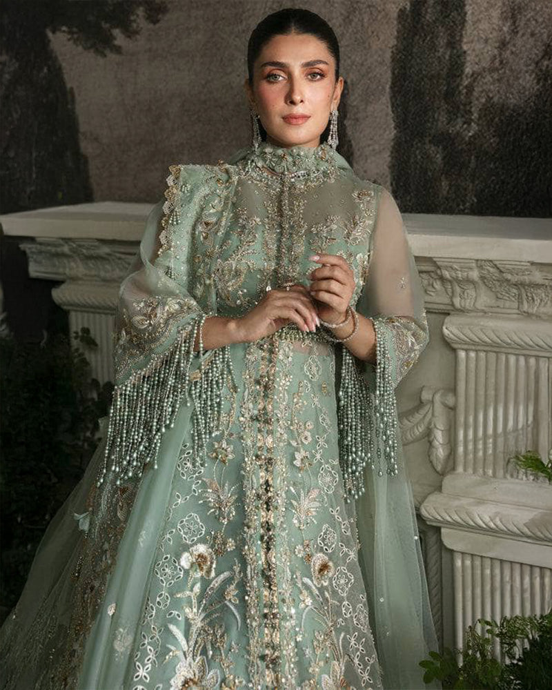 Exude grace and sophistication with this enchanting sea-green organza ensemble, intricately embroidered and embellished for a luxurious finish. With heavily adorned kali panels, borders, and a beautifully crafted dupatta, this outfit is designed to make you stand out at weddings and festive celebrations. Its flowy silhouette and delicate details capture pure sophistication.