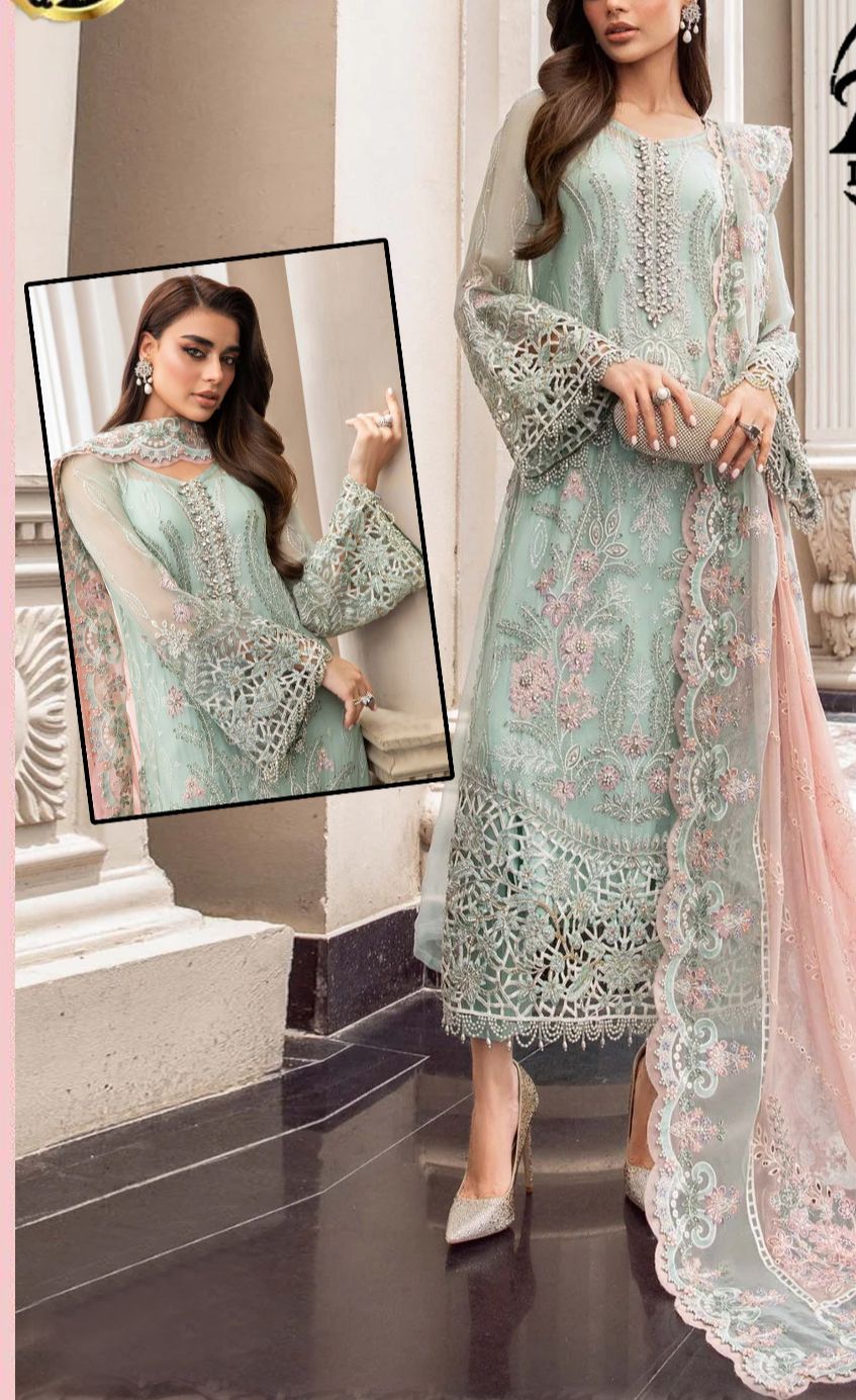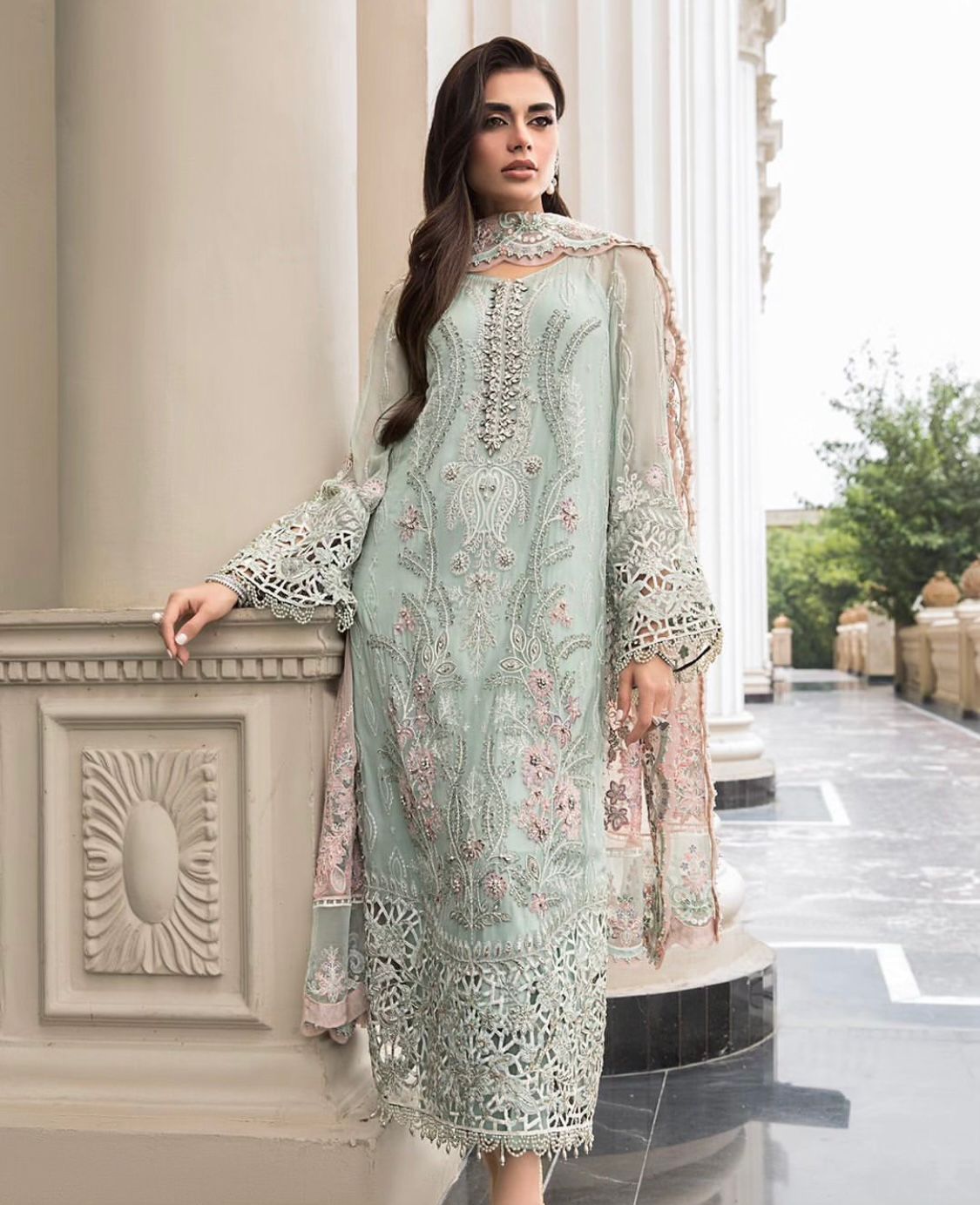 Experience premium couture luxury with this Maria-B heavy chiffon ensemble, beautifully crafted with alternate embroidered spengle work, hand embellishment, cutwork borders, and a delicately designed embroidered dupatta finished with attached bunches.