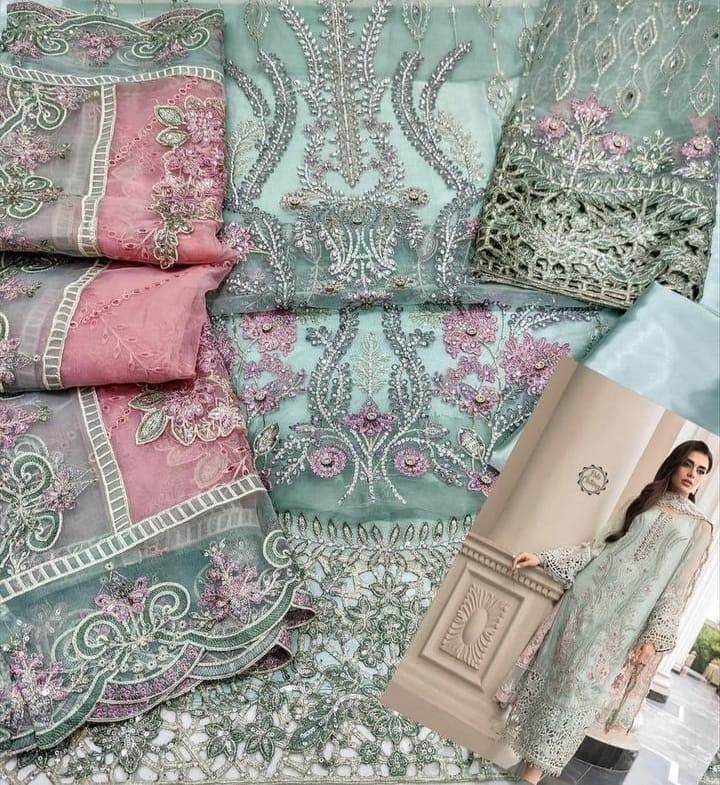 Chiffon fully heavy embroidered schiffli dupatta with 4-side heavy embroidered spengle border attached, along with 4 heavy embroidered bunches.
