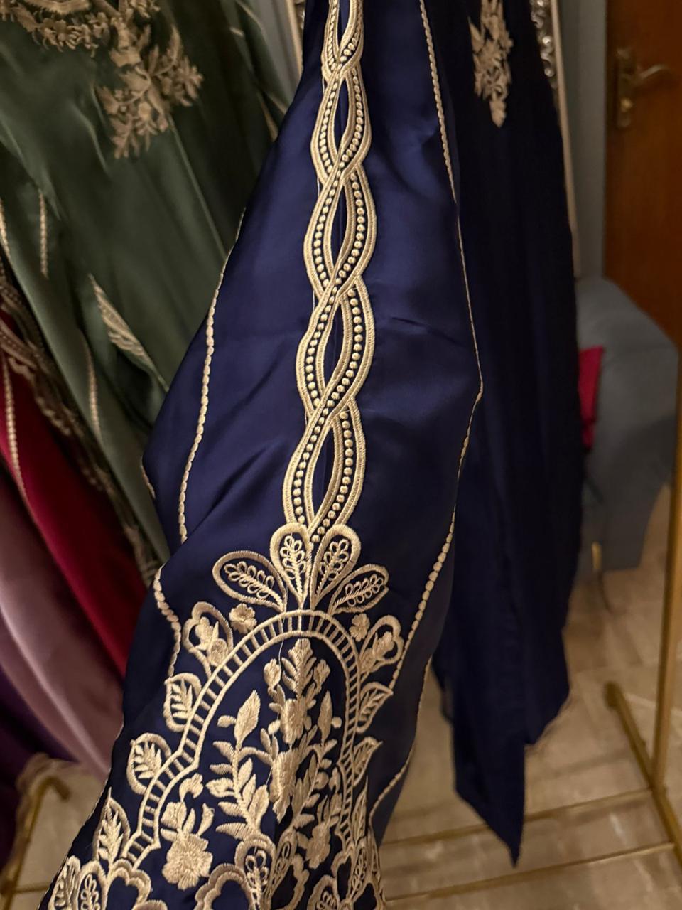 Full embroidered sleeves add depth and refinement, balancing the heavily detailed front and back. The sleeve embroidery ensures that every angle of the outfit reflects elegance.