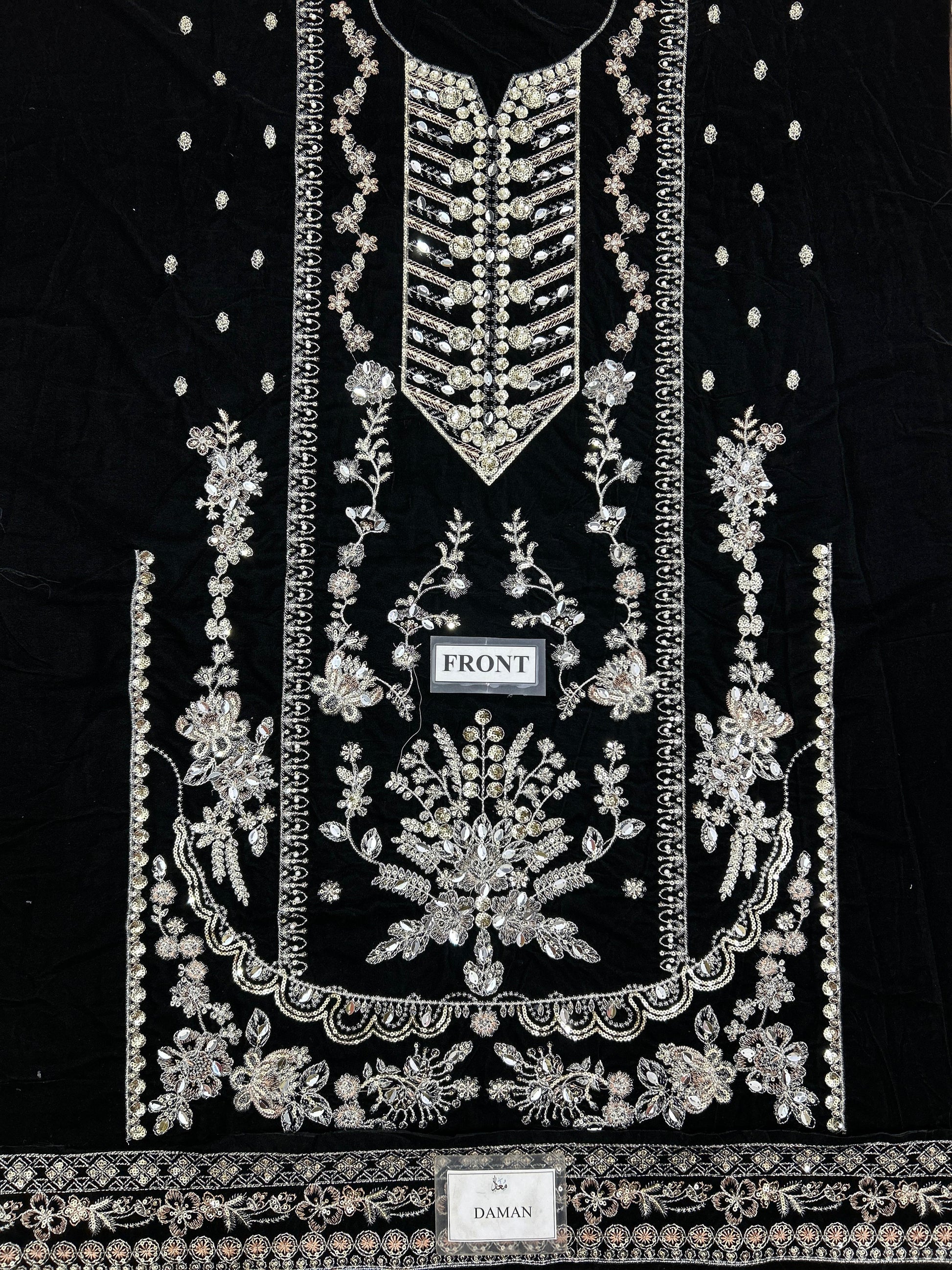 Heavy embroidered velvet front with delicate handwork detailing and embroidered daman, giving a luxurious and opulent appearance.
